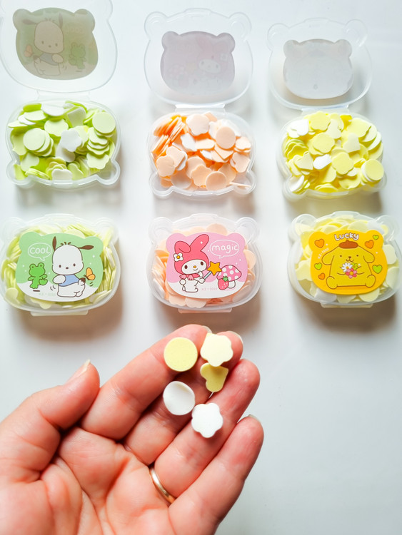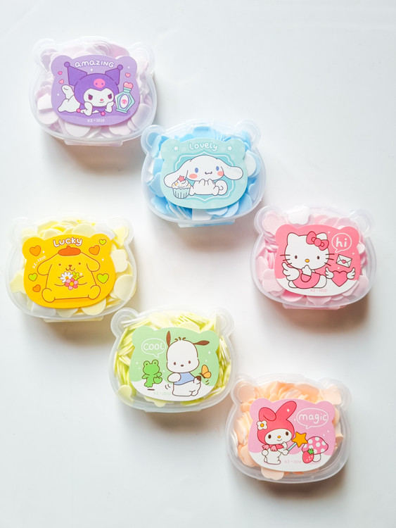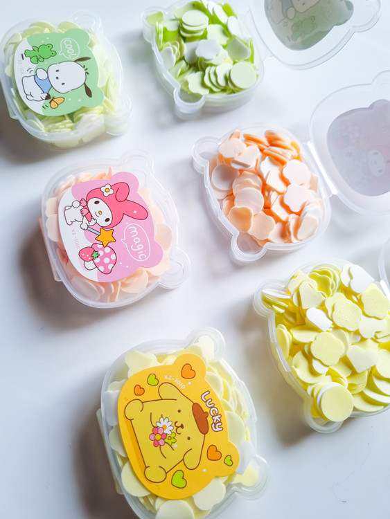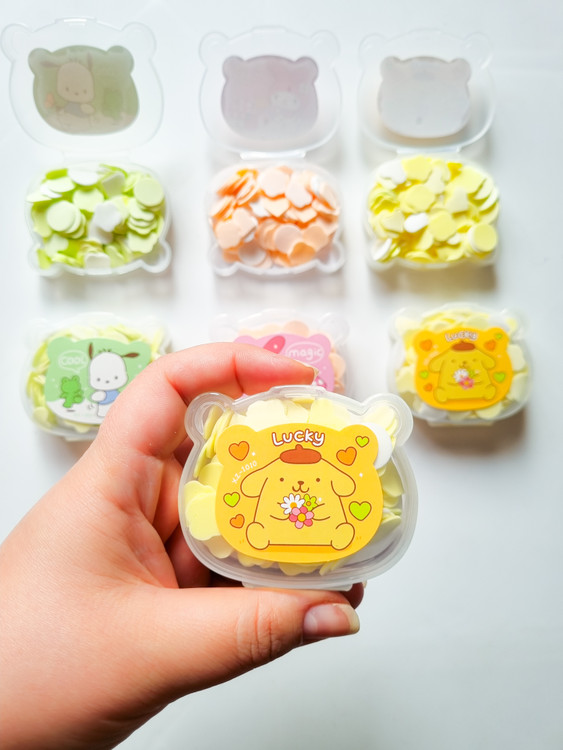 در هر جعبه ۲۴ بسته صابون با طرح های مختلف وجود دارد که داخل هر بسته صابون های کاغذیِ کوچک با اشکال مختلف و معطر قرار دارد.