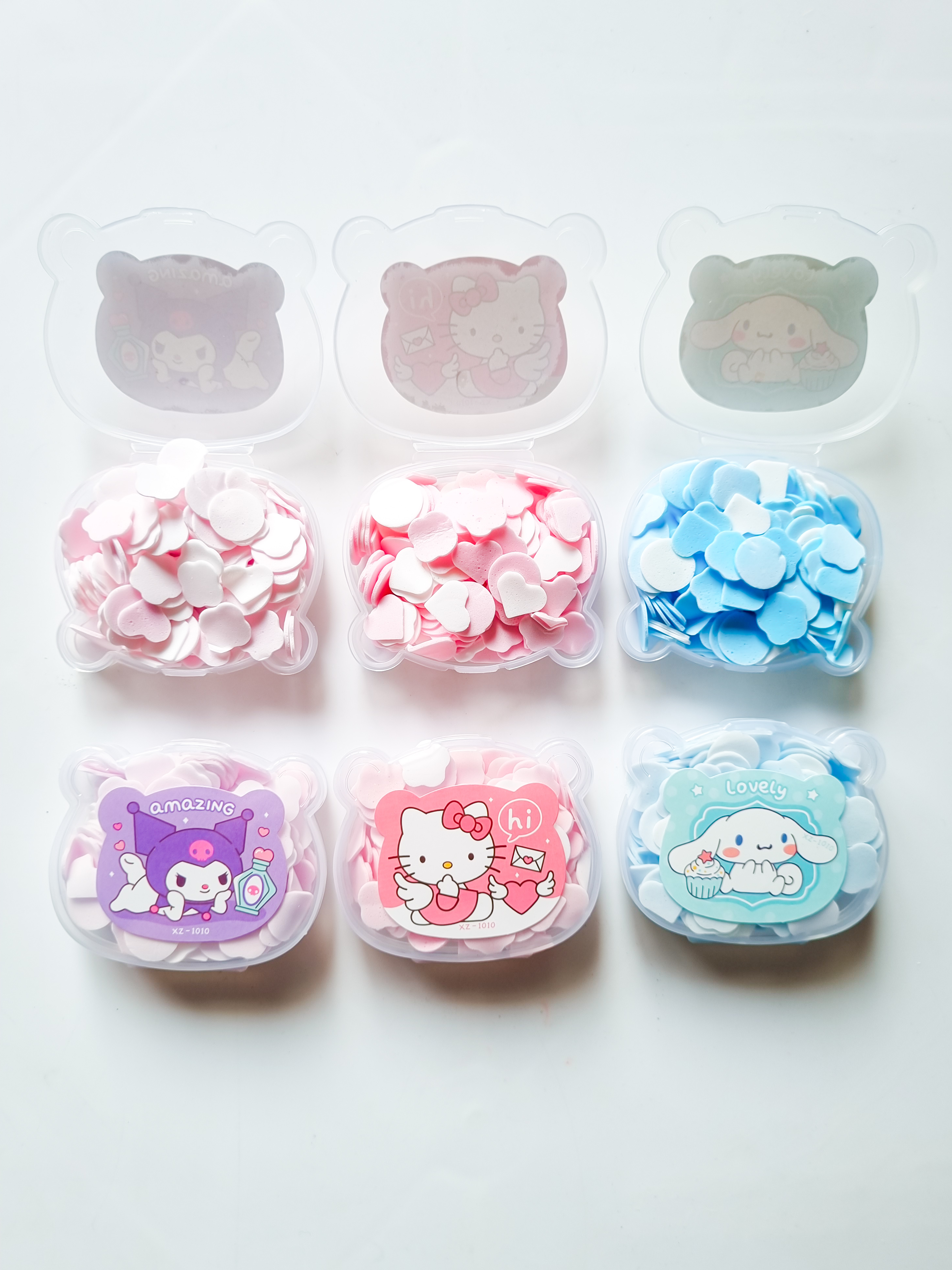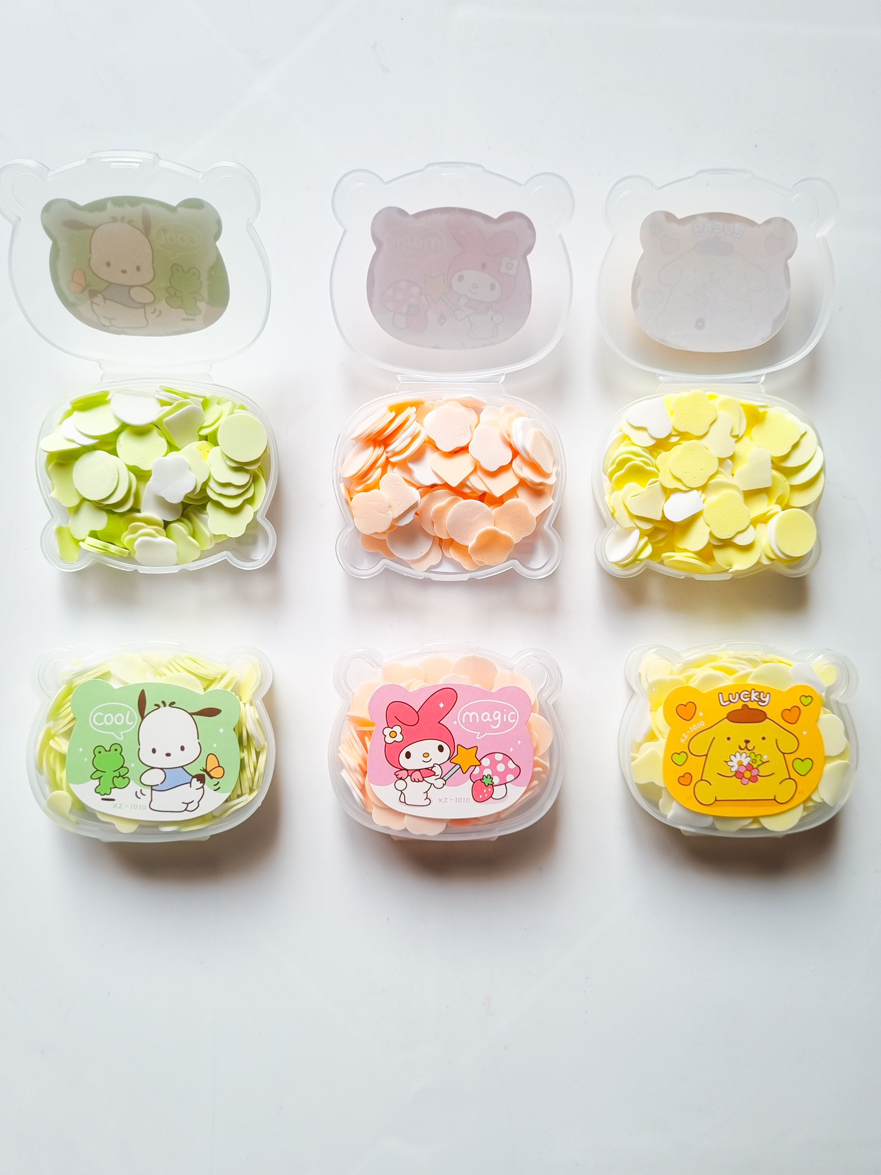 در هر جعبه ۲۴ بسته صابون با طرح های مختلف وجود دارد که داخل هر بسته صابون های کاغذیِ کوچک با اشکال مختلف و معطر قرار دارد.