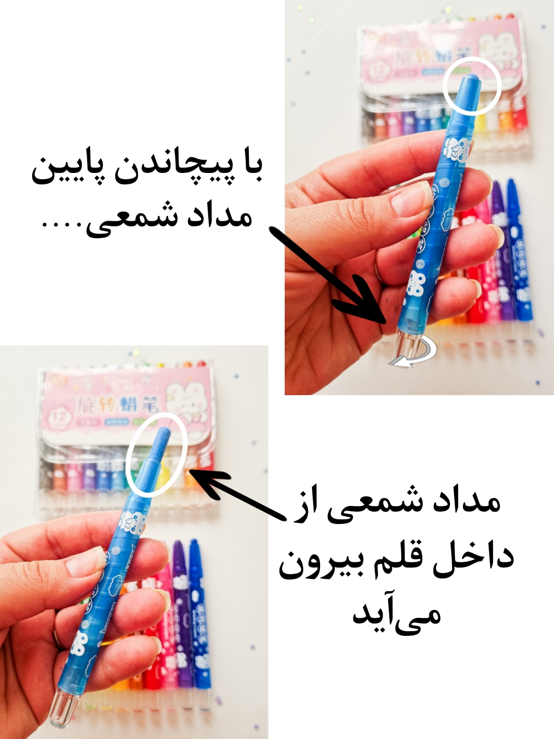 مدادشمعی های پیچی که با پیچاندن قسمت انتهایی مدادشمعی به مقدار دلخواه بیرون میاید.